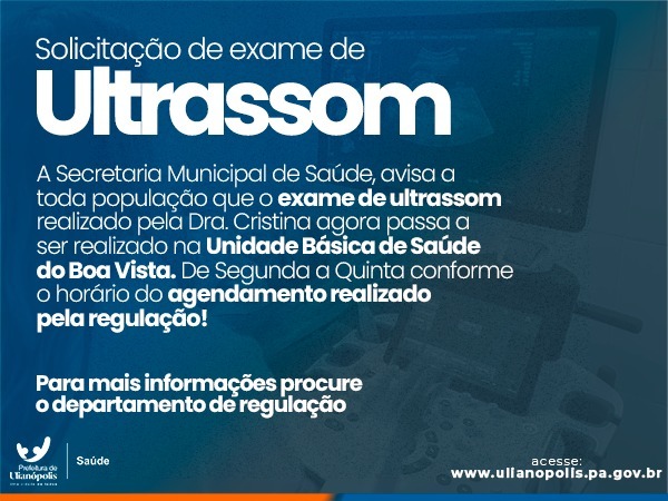 Solicitação de exame de Ultrassom A Secretaria Municipal de Saúde, avisa a toda população que o exame de ultrassom realizado pela Dra. Cristina agora passa a ser realizado na Unidade Básica de Saúde do Bairro Boa Vista. De Segunda a Quinta conforme o horário do agendamento realizado pela regulação! Para mais informações procure o departamento de regulação no prédio da secretaria municipal de saúde. #prefeituradeulianópolis #gestaokellydestro #acidademaisdocedopará #prefeituradeulian�polis #gestaokellydestro #acidademaisdocedopar�