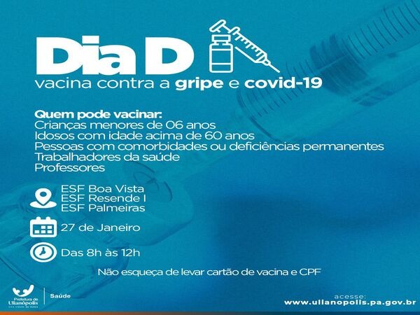 vacina contra a gripe e covid-19 Quem pode vacinar.? Crianças menores de 06 anos Idosos com idade acima de 60 anos Pessoas com comorbidades ou deficiências permanentes Trabalhadores da saúde Professores ESF Boa Vista ESF Resende I ESF Palmeiras 27 de Janeiro Das 8h às 12h Não esqueça de levar cartão de vacina e CPF #prefeituradeulianópolis #gestãokellydestro #umacidadedetodos
