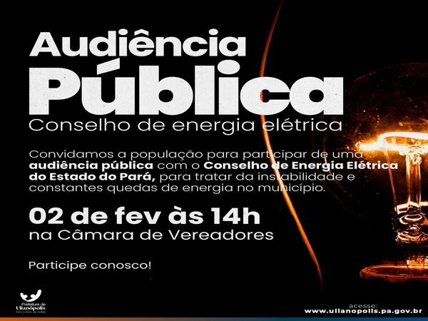 Conselho de energia elétrica Convidamos a população para participarem de uma audiência pública com o Conselho de Energia Elétrica do Estado do Pará, para tratar da instabilidade e constantes quedas de energia no município. 02 de fev às 14h na @camaraulianopolis Participe conosco! #prefeituradeulianópolis #gestãokellydestro #umacidadedetodos