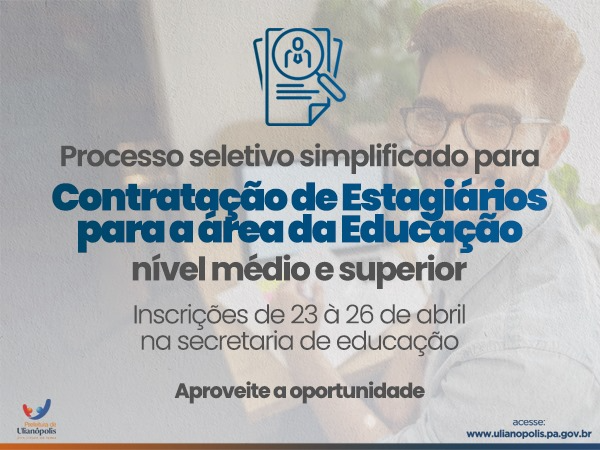 A Prefeitura Municipal de Ulianópolis, torna público o Processo seletivo simplificado para Contratação de Estagiários para a área da Educação nível médio e superior.